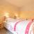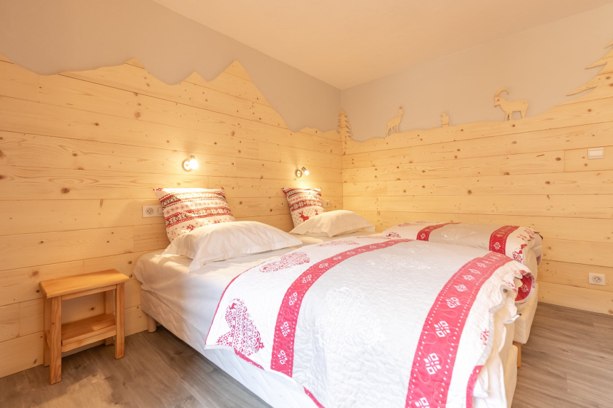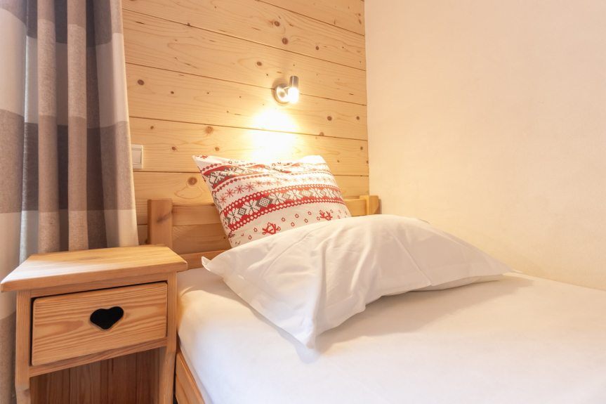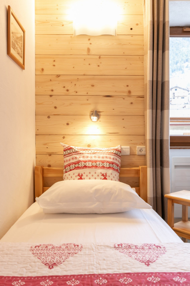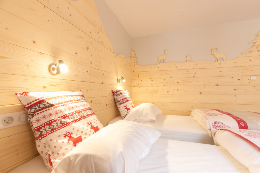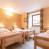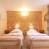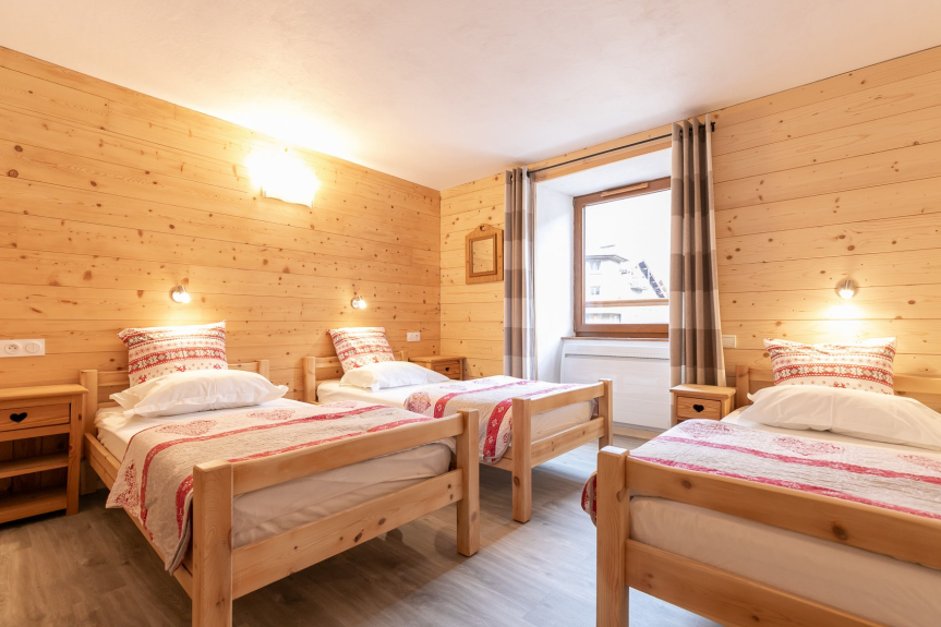 - ein Zimmer mit 3 Einzelbetten, ausgestattet mit je zwei Kissen, zwei Bettdecken 160 x 220 und einer Bettdecke 140 x 200. Das Zimmer hat einen Ablageschrank.