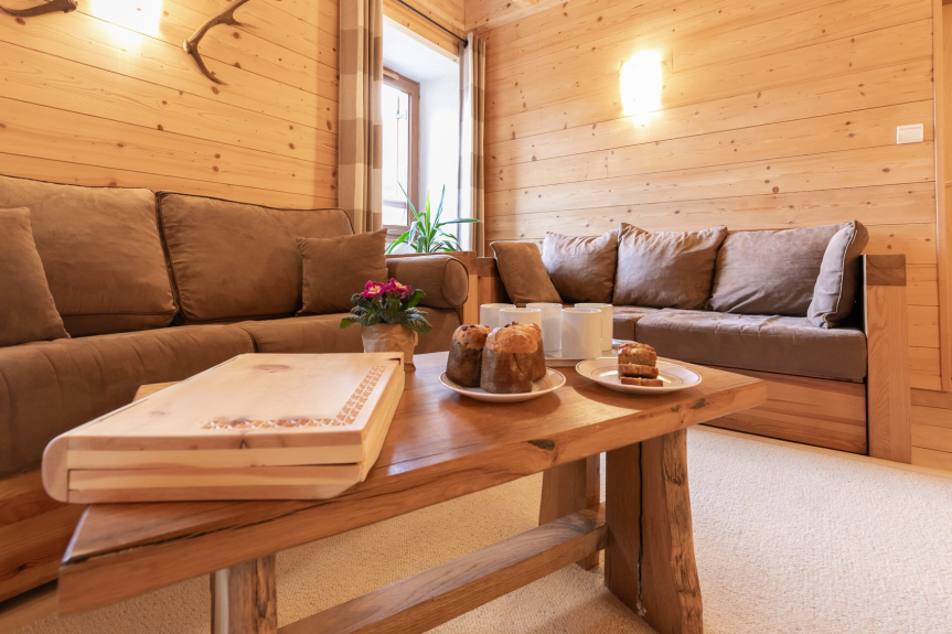 Der Wohnbereich verfügt über einen Flachbildfernseher, einen Couchtisch, zwei Sofas, von denen eines ein Flex-Bett für 2 Personen ist, das mit Kissen und einer 220 x 240 großen Bettdecke ausgestattet ist.