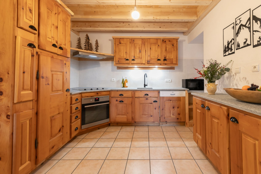 Die Küche ist mit einem Cerankochfeld, einem Geschirrspüler, einem Elektroofen, einer Mikrowelle und einer Dunstabzugshaube ausgestattet.