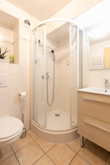 - ein Badezimmer, das an das große Schlafzimmer angrenzt, mit Dusche, Waschbecken und WC.