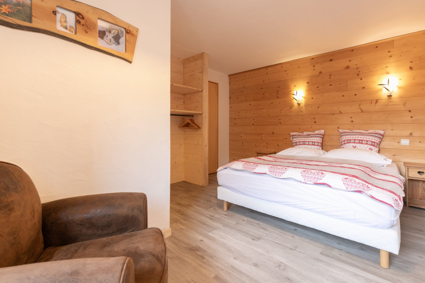 - Ein Schlafzimmer mit einem Doppelbett 160 x 200, ausgestattet mit 4 Kissen und einer Bettdecke 240 x 260. Ein Ablageschrank, ein Tisch und zwei Stühle vervollständigen die Ausstattung des Zimmers.