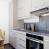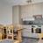 Küche offen zum Wohnzimmer, Cerankochfeld, Mikrowelle, traditioneller Backofen, Geschirrspüler und Kühl-/Gefrierschrank.