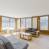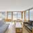 Wohnzimmer mit Sofa, Essecke, Fernseher, DVD-Player, Iphone-Station und großen Erkerfenstern.