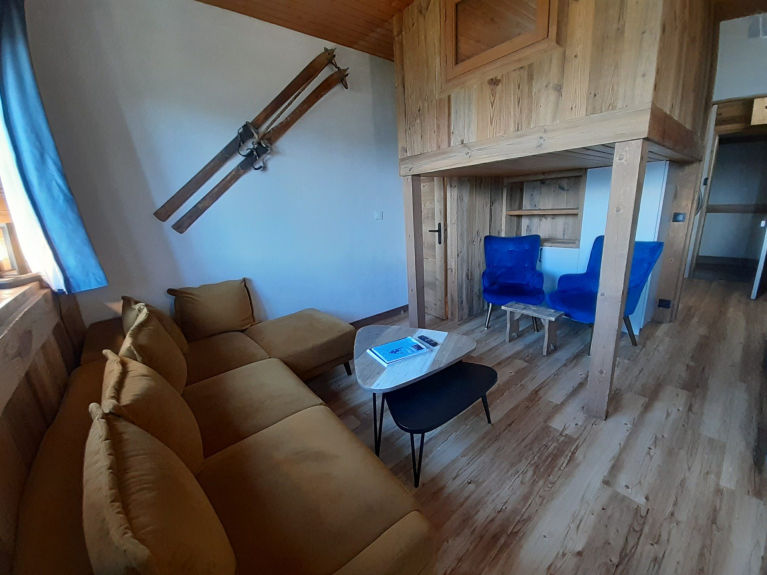 Geschlossenes Zwischengeschoss mit einem Doppelbett, das vom Wohnbereich aus zugänglich ist.