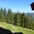 Wohnzimmer mit Westbalkon und Blick auf den umliegenden Wald, mit Schlafsofa und Fernseher.