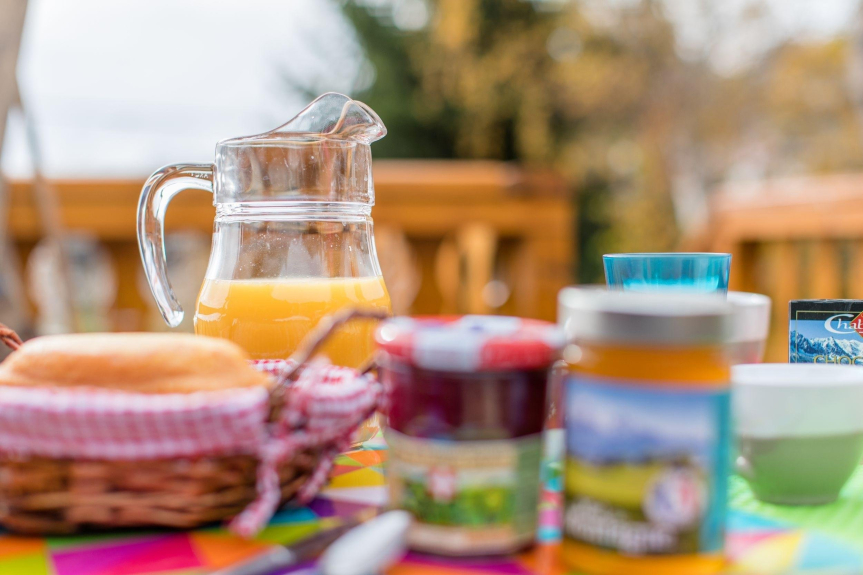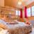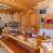Die Dekoration ist typisch (Vorhänge, Doppeltüren, Eispickel, alte Skier, Vertäfelungen usw.).