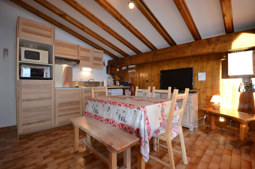 Eine 35 m² große Zweizimmerwohnung für 4/5 Personen im 2. Stock mit einem Südbalkon mit Blick auf die Pisten.