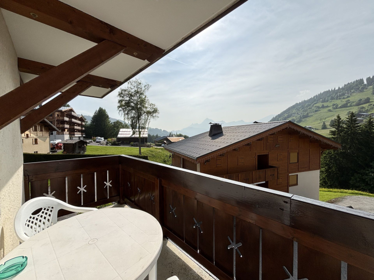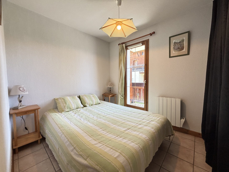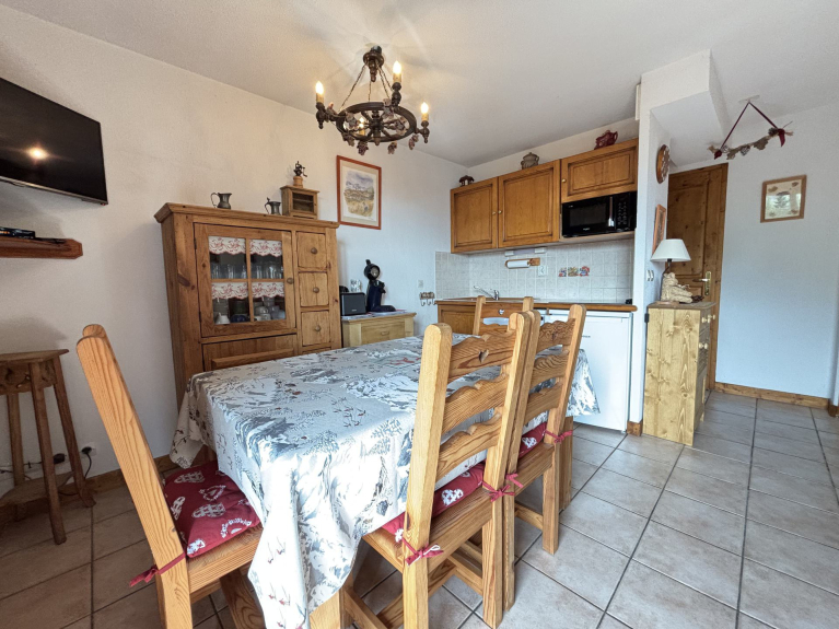 Auf 1350m, am Fuße der Mont Rond Pisten, 39m² Wohnung für sechs Personen. Im ersten Stock gelegen, bietet der NORD-Balkon einen Blick auf den Mont Charvin und das Tal und der West-Balkon einen Blick auf den Beginn der Pisten.