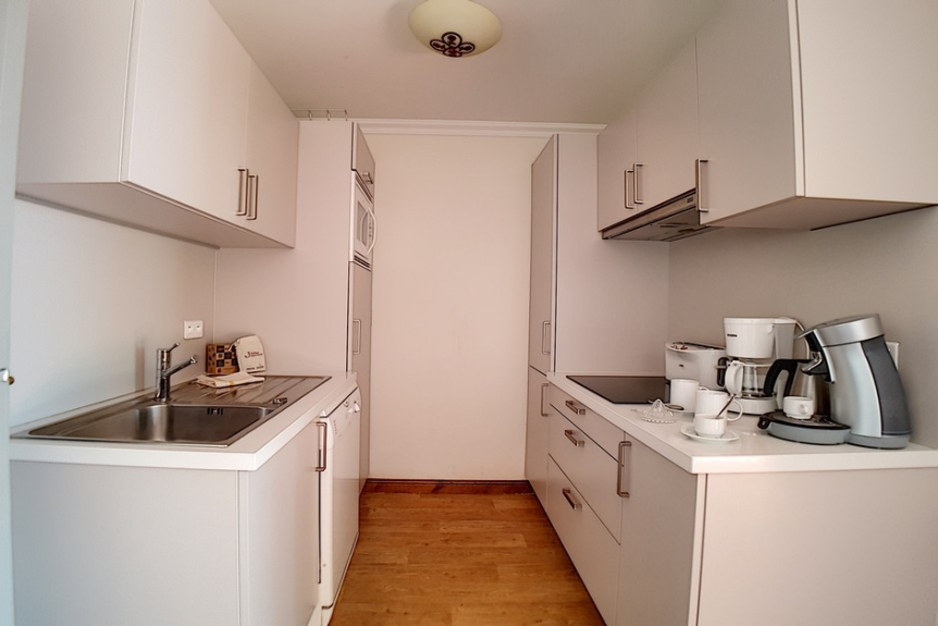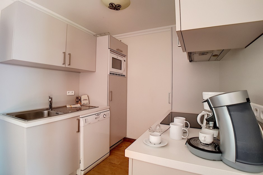 Offene Küche mit 4 Induktionskochplatten, Kühlschrank, Backofen, Mikrowelle, Geschirrspüler.
