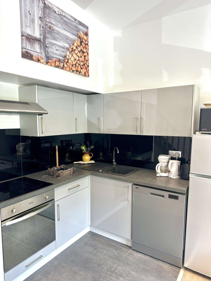 Küchenbereich: Backofen, Mikrowelle, Geschirrspüler, Kühl-/Gefrierschrank, 3 Cerankochfelder