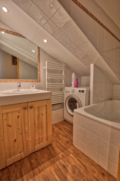 - Zwei Badezimmer: eines mit Dusche und eines mit Badewanne und Waschtrockner.