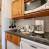 Einbauküche mit 2 Kochplatten, Mikrowellenherd, Kühlschrank und Geschirrspüler, Wasserkocher, Toaster und Kaffeemaschine.