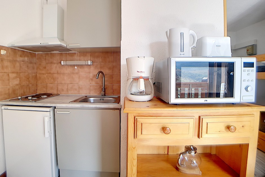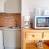 Küche mit 2 elektrischen Kochplatten, Kühlschrank, Mikrowelle, Wasserkocher, Kaffeemaschine und Toaster.