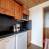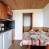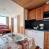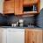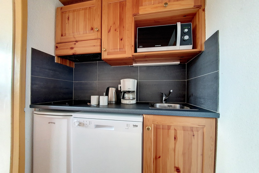 Einbauküche mit 2 Kochplatten, Mikrowelle, Kühlschrank, Geschirrspüler, Toaster, Wasserkocher und Kaffeemaschine.