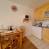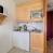 Einbauküche mit 2 Kochplatten, Mini-Backofen, Mikrowelle, Kühlschrank und Geschirrspüler, Wasserkocher, Kaffeemaschine und Toaster.