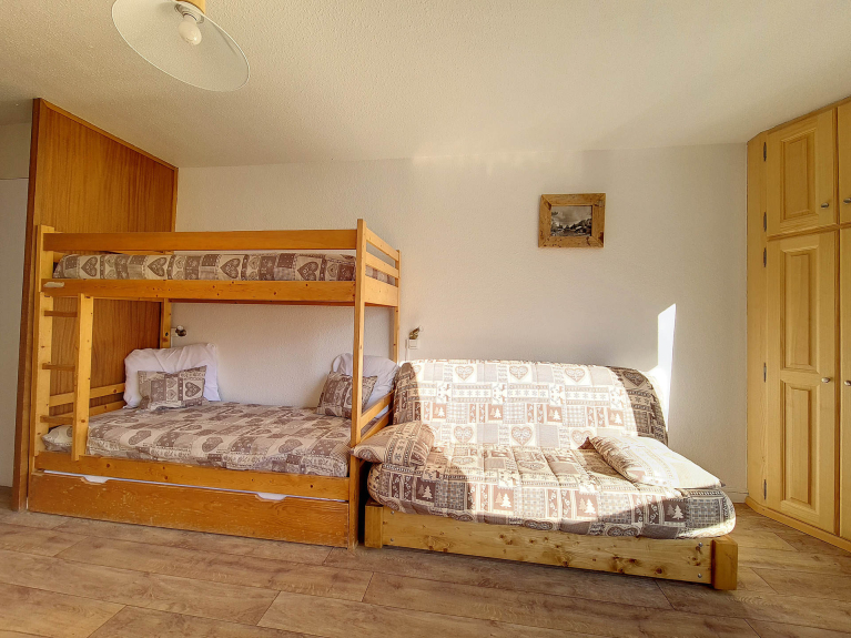 Wohnzimmer: 2 Etagenbetten für 1 Person und 1 BZ-Sofa (160).