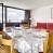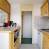 Küche mit 2 Kochplatten, Kühlschrank, Backofen/Mikrowellenkombination, Geschirrspüler, Toaster, Wasserkocher und Kaffeemaschine.
