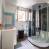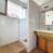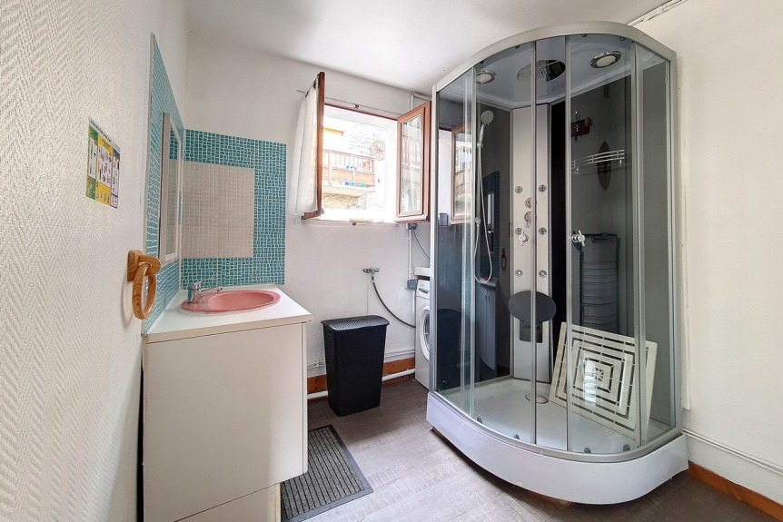 Badezimmer: Dusche, Waschbecken und Waschmaschine.