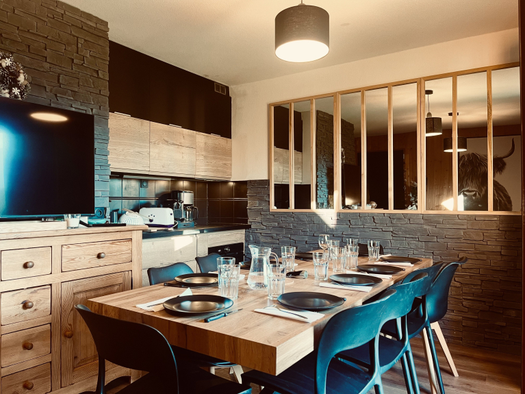 Das Chalet bietet eine voll ausgestattete Küche (Nespresso, klassische Kaffeemaschine, Backofen, Induktionskochfeld, großer Kühlschrank und Gefrierschrank, Mikrowelle, Geschirrspüler, Raclette-, Fondue- und Crêpes-Geräte).