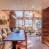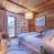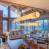 Großes Wohnzimmer mit einem Balkon auf zwei Seiten, mit Kamin und Essbereich.