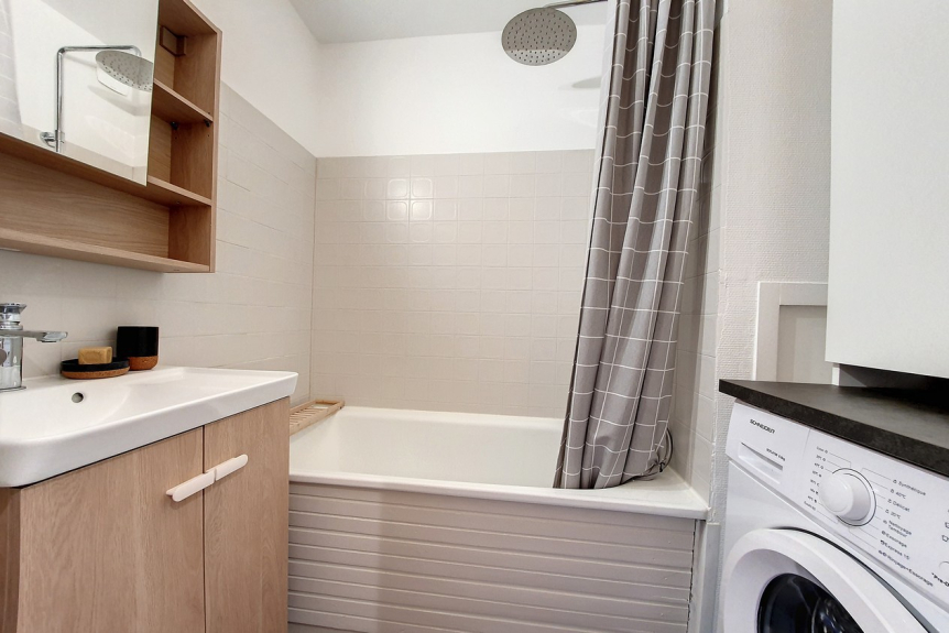 Badezimmer mit Badewanne und Waschmaschine.
