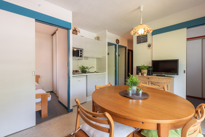 Praktischerweise verfügen Sie über eine voll ausgestattete Küche, die sich zum Wohnbereich hin öffnet und einen Esstisch für 4 Personen bietet.