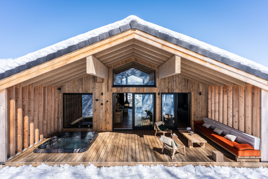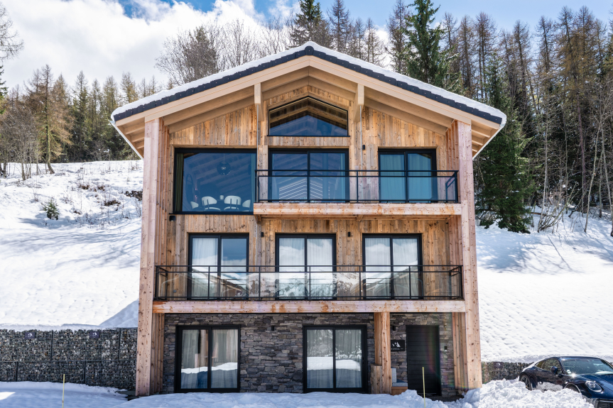 Besondere Aufmerksamkeit wurde den Materialien gewidmet, in einem zeitgenössischen alpenländischen Stil, der natürlichen Materialien wie Stein und Holz den Vorzug gibt.