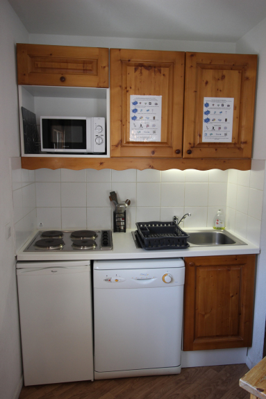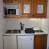 Küchenecke: 4 Kochplatten, Backofen, Mikrowelle, Kühlschrank, Geschirrspüler und sämtliches Geschirr.