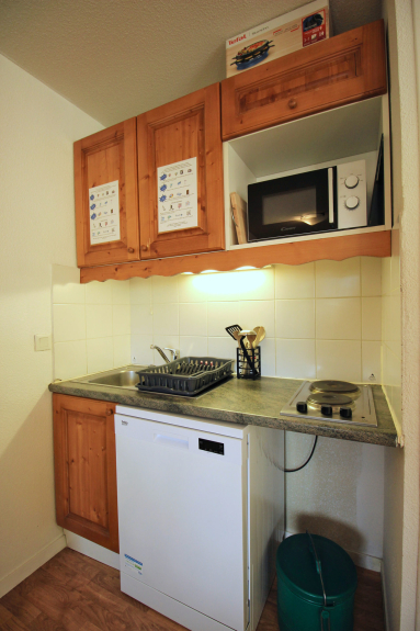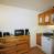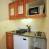 Küchenecke: Elektroherd, Mikrowelle, Minibackofen, Kühlschrank mit Gefrierfach, Spülmaschine und Küchenutensilien.