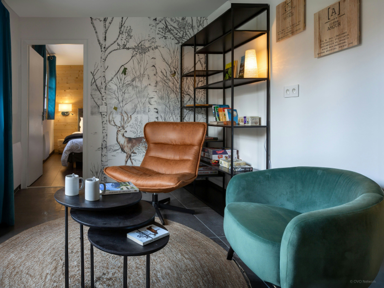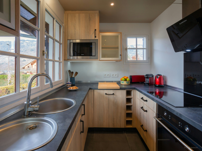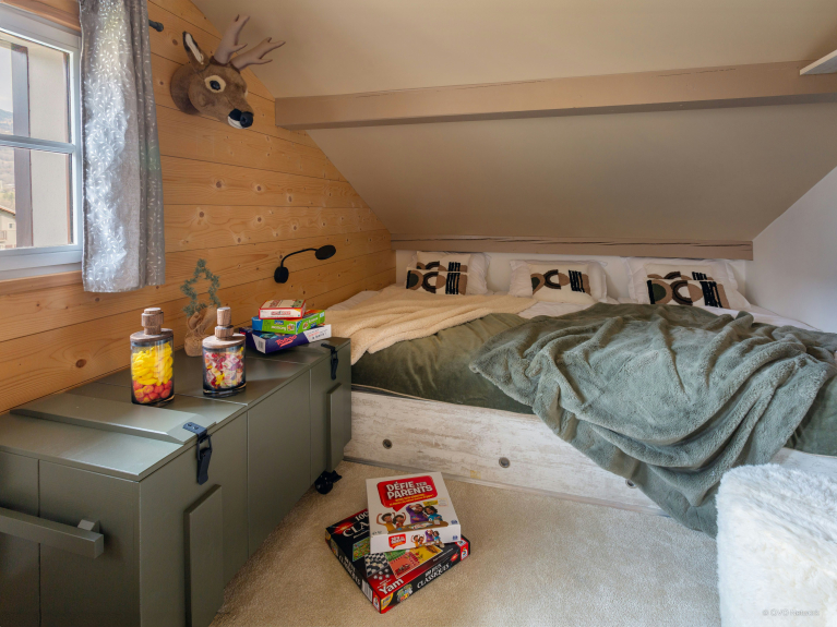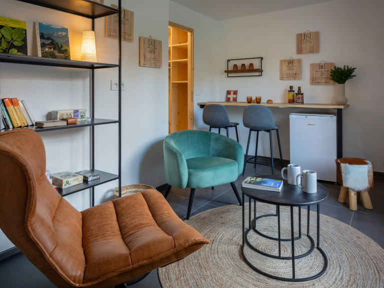 Im ersten Stock befinden sich die helle Küche und das Wohnzimmer, das mit einem L-förmigen Sofa, einem Fernseher, einem Esstisch und einem Holzofen ausgestattet ist und eine gemütliche Atmosphäre schafft. Dieses Wohnzimmer öffnet sich zu einer nach Süden ausgerichteten Terrasse mit einem kleinen Tisch und einem Grill. Im Erdgeschoss befindet sich ein gemütliches Lesezimmer, das mit Gesellschaftsspielen und einem Kühlschrank ausgestattet ist und einen idealen Ort bietet, um sich nach einem Tag voller Aktivitäten zu entspannen.
