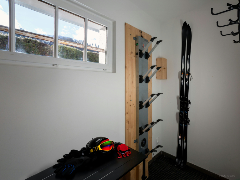 Im Erdgeschoss befinden sich ein Skiraum mit beheiztem Schuhtrockner, eine Waschküche mit Waschmaschine und Trockner sowie eine Garage für zwei Autos und ein Stellplatz im Freien.