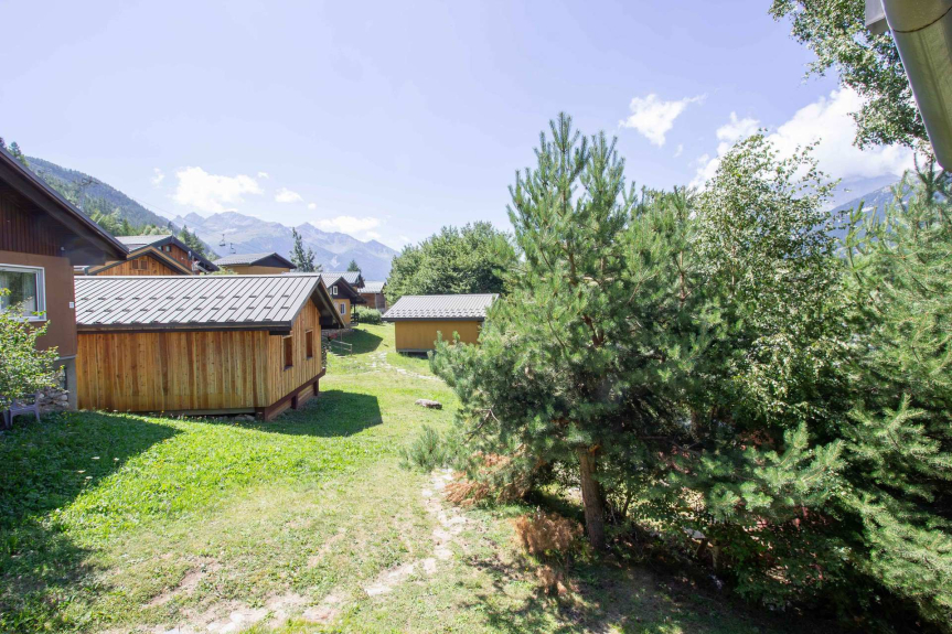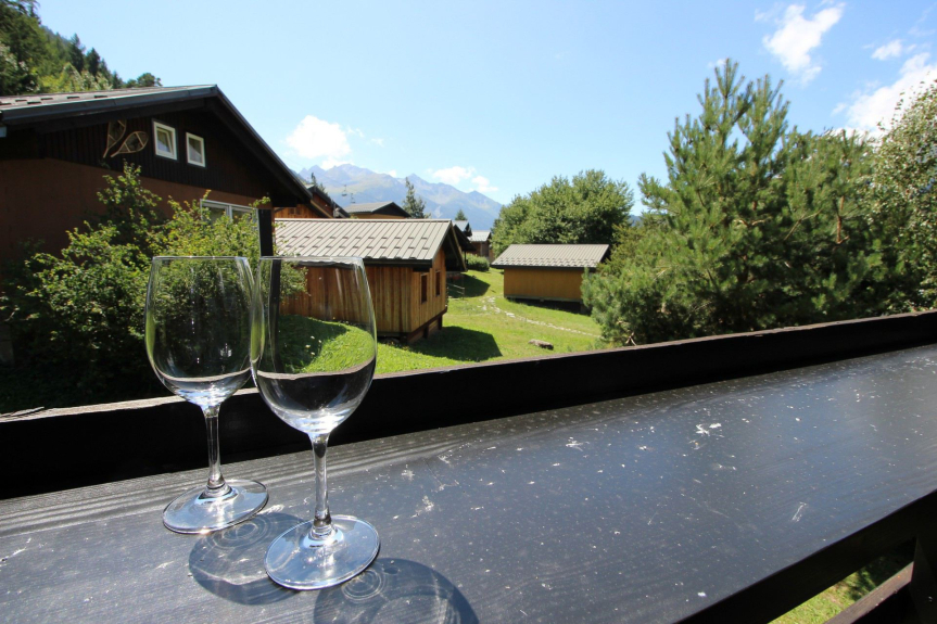 CHALET INDIVIDUEL 2 PIECES 6 PERSONEN von 55 m² in Les Oursières, Südlage mit einer Terrasse, die gerade eingerichtet wird.