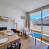 Küche mit 2 Induktionskochplatten, Dunstabzugshaube, Minibackofen, Mikrowelle, Kühlschrank, Geschirrspüler, Senseo-Kaffeemaschine, Toaster und Wasserkocher.