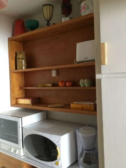 Einbauküche: 2 Ceranfelder, Kühlschrank, Minibackofen, Minigeschirrspüler, Mikrowelle, Wasserkocher, Toaster und Kaffeemaschine.