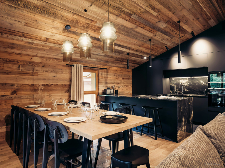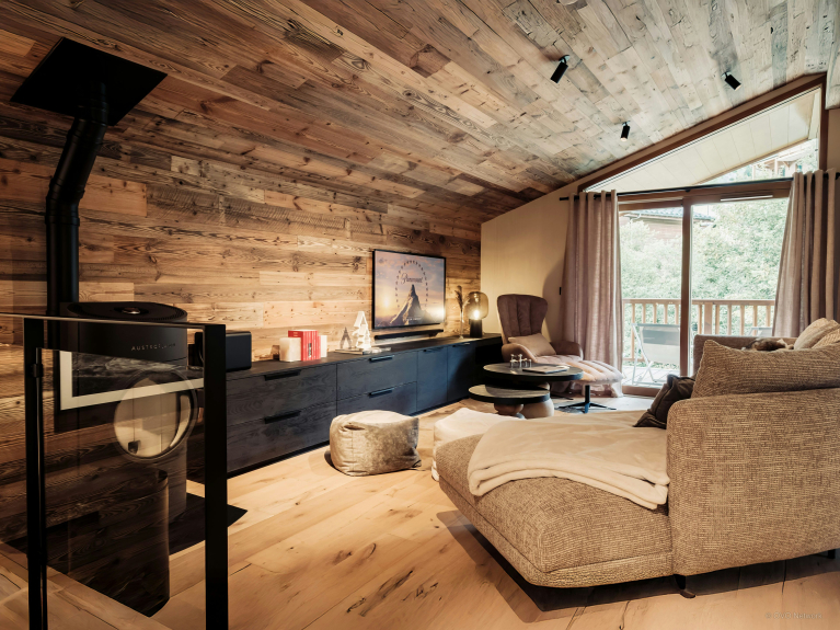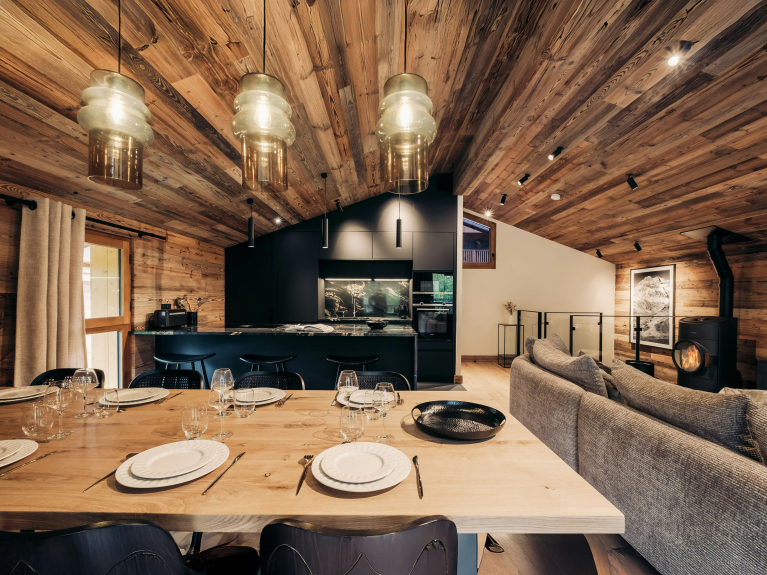 Die obere Etage ist einem großen, besonders einladenden Wohnraum mit einer warmen Holzdekoration gewidmet. Das Wohnzimmer verspricht mit seinem Holzofen, dem Sofa und dem Fernseher entspannende Momente. Die moderne Küche verfügt über eine zentrale Theke und einen großen Esstisch, an dem alle gemeinsam essen können. Dieser Raum öffnet sich zu einem möblierten Balkon, wo ein zweiter Esstisch und eine Sitzecke einen angenehmen Rahmen bieten.