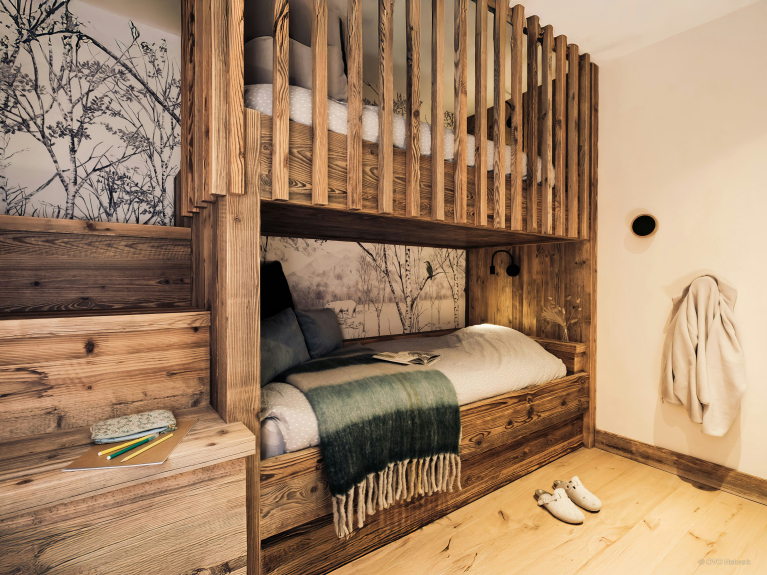 Der Eingangsflur führt in den Schlafbereich, der aus drei gemütlichen Doppelzimmern und einem Schlafsaal mit Etagenbett für zwei Kinder besteht. Eines der Schlafzimmer verfügt über ein eigenes Badezimmer mit Toilette, während die anderen sich ein zweites Duschbad und eine separate Toilette teilen.