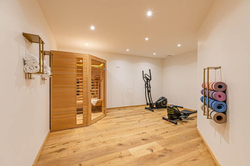Ein privater Wellnessbereich erwartet Sie: Sauna, Sportgeräte und Yogamatte, um zu jeder Jahreszeit Gelassenheit und Vitalität zu vereinen.