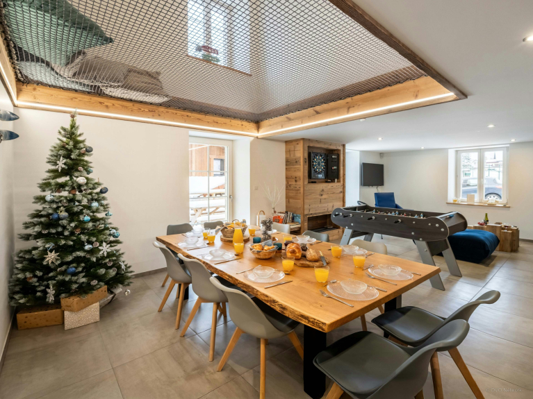 Der Wohnraum ist natürlich das Herz des Chalets. Hier können Sie die Wärme des Kaminfeuers genießen und sich zu einer Partie Tischfußball oder Darts treffen. Direkt darüber befindet sich ein Spielzimmer, dessen Netzboden es den Kindern ermöglicht, sich zu vergnügen und gleichzeitig in Hörweite zu bleiben. Dieser spielerische Ansatz verleiht dem Refuge de Lucien einen besonderen Charakter.