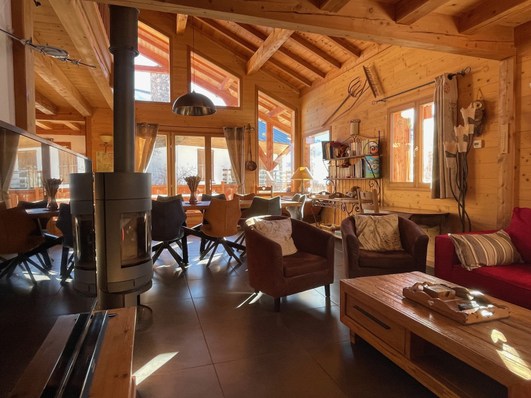 Geräumiger Wohnraum mit großzügigem Volumen und viel Sonne. Gemütliche Atmosphäre, gepflegte Dekoration. Wohnzimmer mit Ecksofa, Sesseln, Großbildfernseher, Satellitenempfang, TV-Box und Wifi (Glasfaser), Holzofen, Bibliothek mit zahlreichen Büchern und Gesellschaftsspielen.
