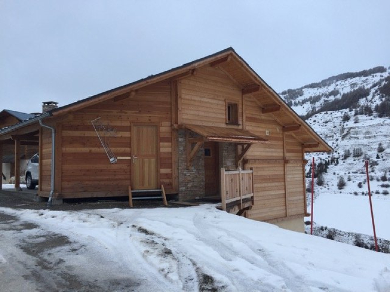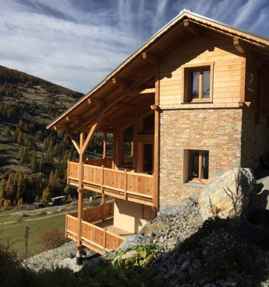 Schönes, neues Chalet aus Lärchenholz mit großer, sonnenverwöhnter Terrasse. Schöner Panoramablick. Pisten in 500m Entfernung, kostenloser Pendelbus vor dem Chalet.