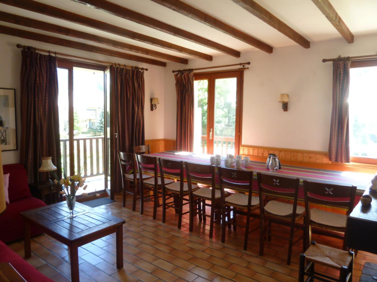 Ideal für 2 oder 3 Familien, 5 Schlafzimmer, 2 durch eine Tür geschlossene Bergecken, Wohnzimmer mit Kamin, unabhängige Küche, 3 Duschräume, 1 Duschraum, 4 Toiletten (1 unabhängig), elektrische Heizung, Ski- und Fahrradraum, kostenloser WiFi-Anschluss im Chalet".
