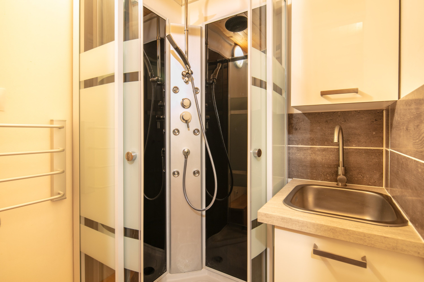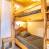 On the ground floor: a living room/kitchen with dining area equipped with a sofa bed (2 pers.), a bathroom, a separate toilet and a bedroom with 2 single beds.