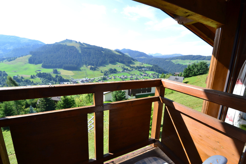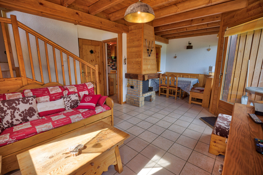 Half chalet SOREAU. 3 rooms, 7 persons, 55 sqm + 10 sqm less than 1.80m, balcony facing SOUTH, exceptional view ont he Mont Rond and the valley. On 3 half floor, it includes :