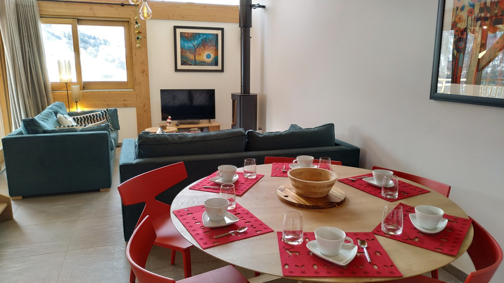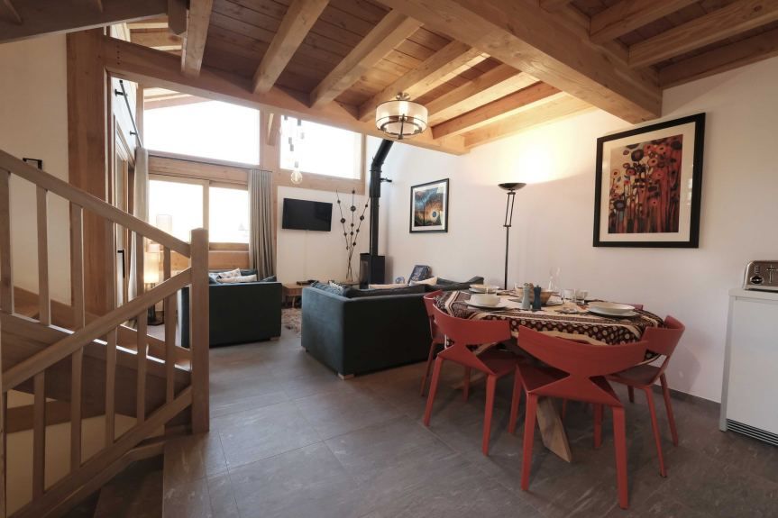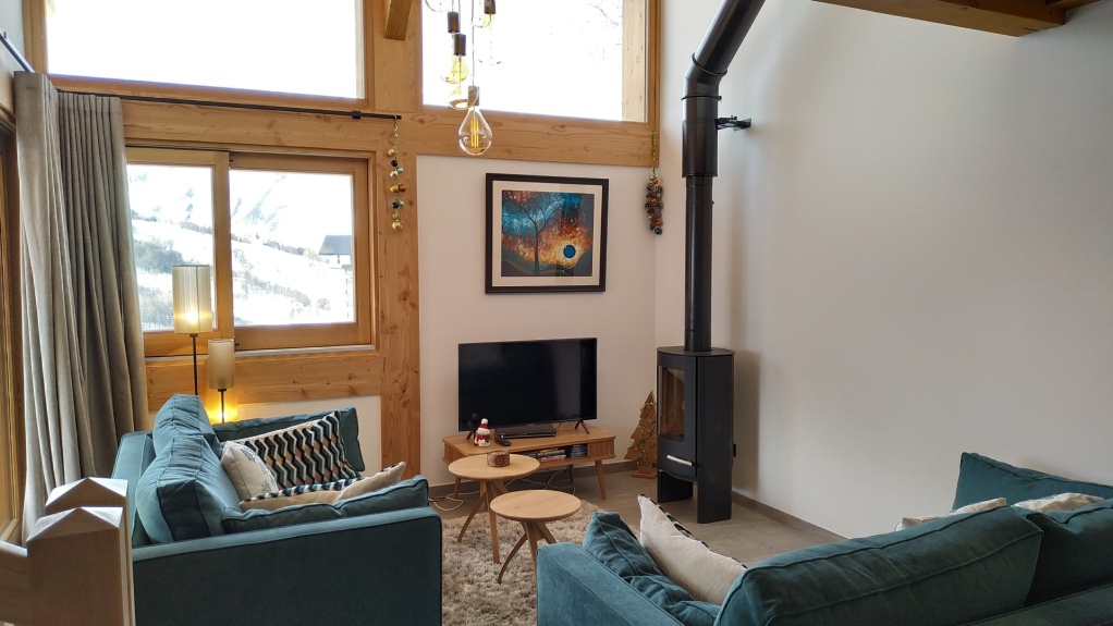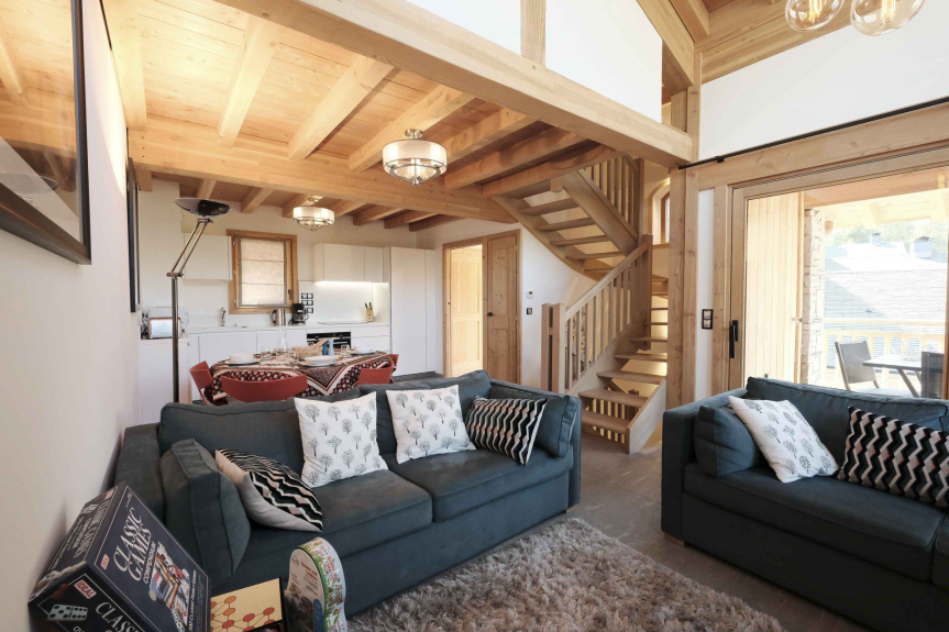 Chalet SERENDIPITY is a comfortable open plan chalet decorated in vibrant warm tones with a stove and 2 large sofas, it is ideal for relaxing in after a day of fun in the mountains.