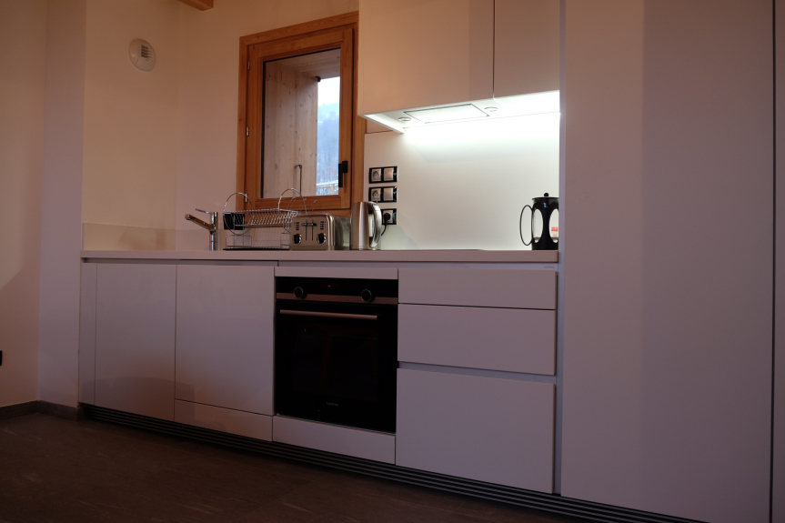 The fully equipped kitchen comes complete with induction hob, oven, microwave, coffee maker, kettle, toaster, French press.