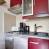 Kitchen equipped with 2 electric plates, dishwasher, microwave, refrigerator, kettle, coffee maker and toaster.