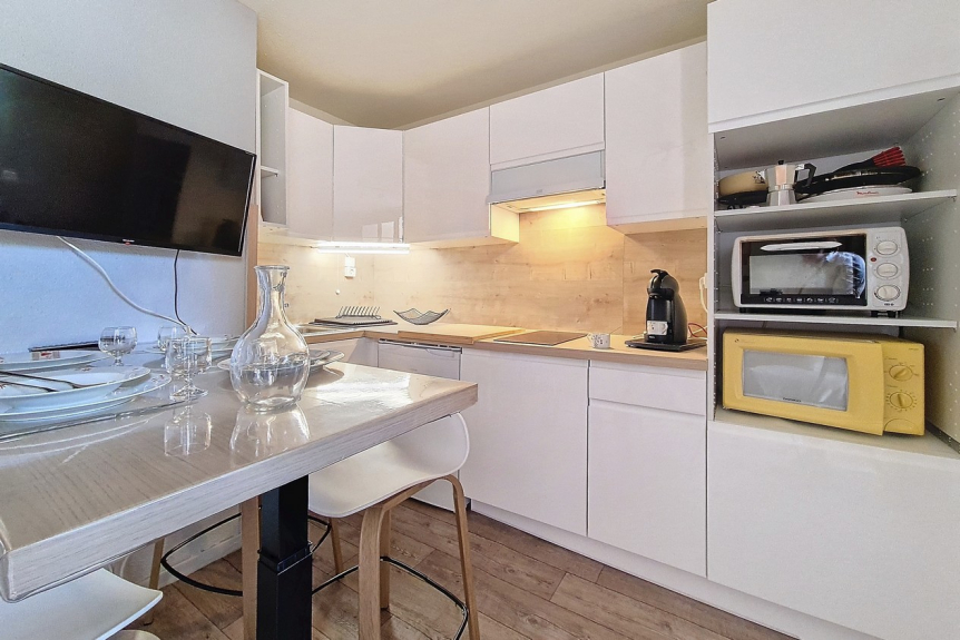 Kitchen equipped with 2 electric plates, refrigerator, microwave, mini dishwasher, kettle, coffee maker and toaster, mini electric oven.