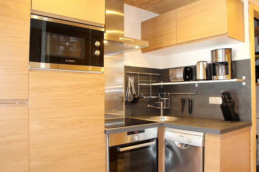 Kitchen equipped with 4 induction hobs, refrigerator, traditional oven, microwave, dishwasher, coffee maker, toaster and kettle.