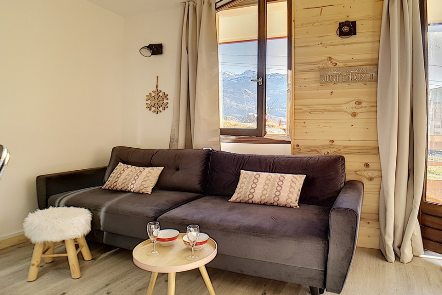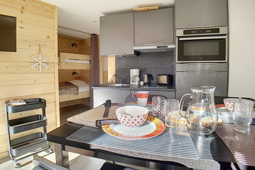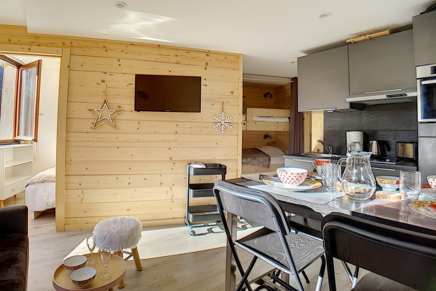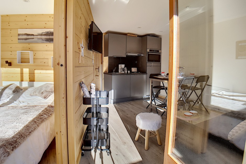 The plus : Its configuration with a bedroom and a mountain corner allows you not to sleep in the living room.