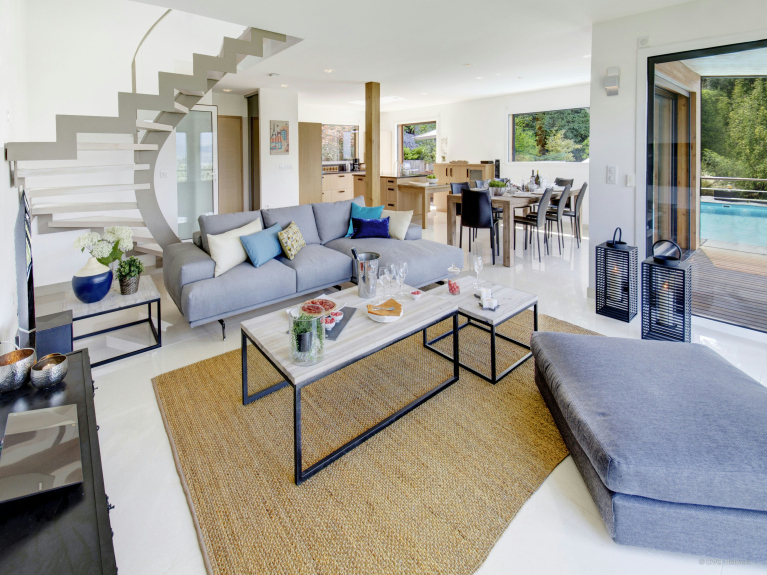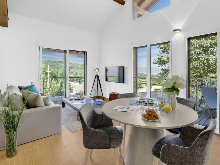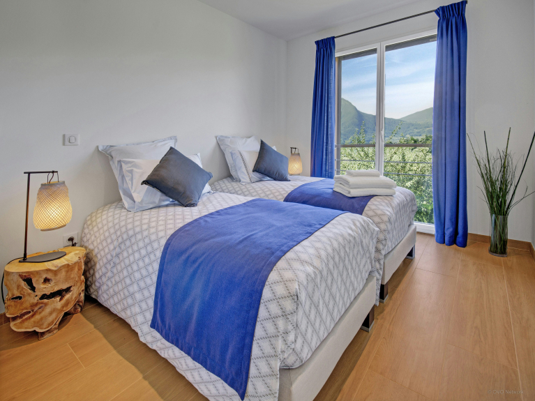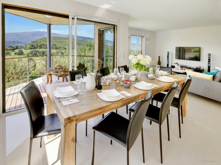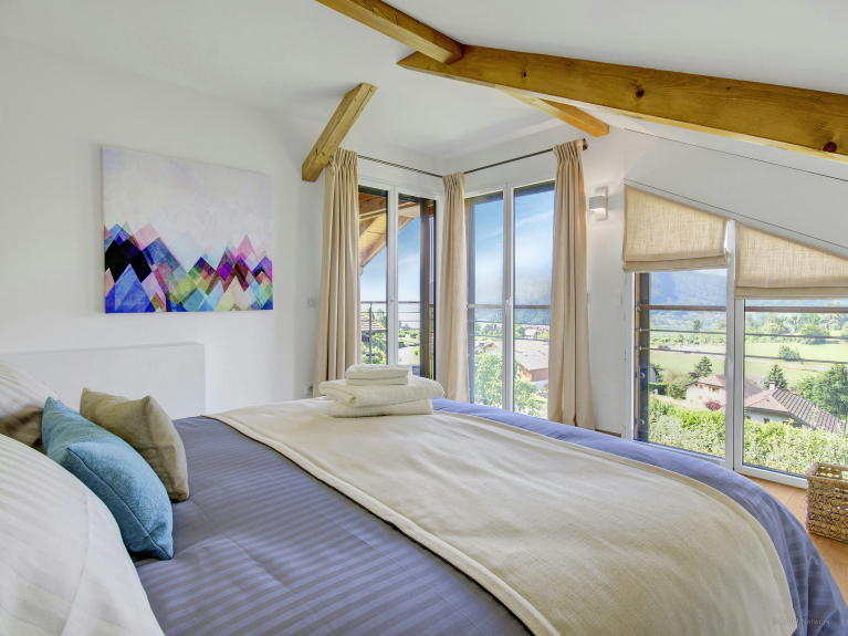 The terraces and balconies of this superb contemporary villa, located on the heights of Talloires, offer magnificent views of Lake Annecy and the surrounding mountains. The ski resorts of La Clusaz and La Croix-Fry are just over half an hour away. The villa has just been refurbished and offers spacious and comfortable accommodation for 8 people. NOTE: cleaning, linen and towels included.